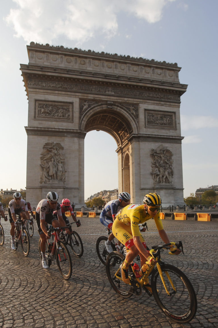 Slovinský cyklista Tadej Pogačar v žltom drese lídra Tour de France počas záverečnej 21. etapy s tradičným cieľom na Elyzejských poliach v Paríži. Foto: Christian Hartmann, Pool via AP.