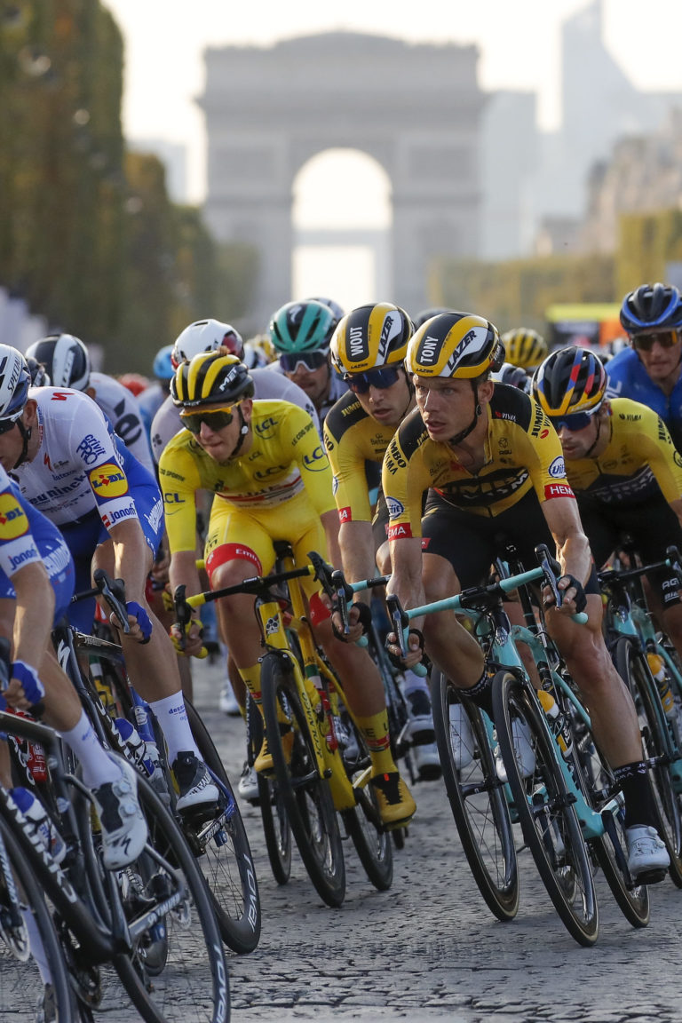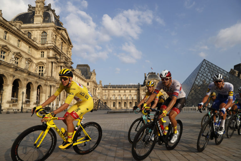Slovinec Tadej Pogačar v žltom drese víťaza Tour de France počas záverečnej 21. etapy Tour de France 2020 so štartom v Mantes la Jolie a cieľom na Elyzejských poliach v Paríži. Foto: SITA/AP.