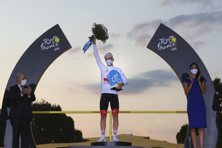 Slovinec Tadej Pogačar v bielom drese pre najlepšieho cyklistu do 25 rokov po záverečnej 21. etape Tour de France 2020 s tradičným cieľom v Paríži. Foto: SITA/AP.