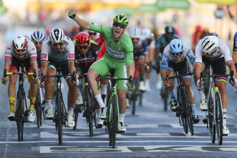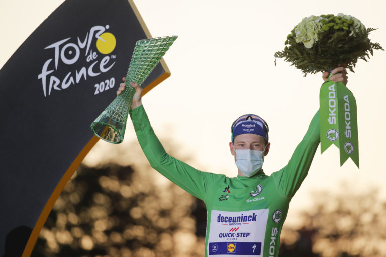 Írsky cyklista Sam Bennett v zelenom drese víťaza bodovacej súťaže sa teší z triumfu v záverečnej 21. etape Tour de France 2020 s tradičným cieľom na Elyzejských poliach v Paríži. Foto: Christophe Petit-Tesson/Pool via AP.