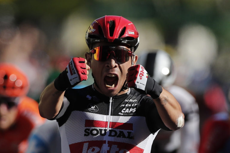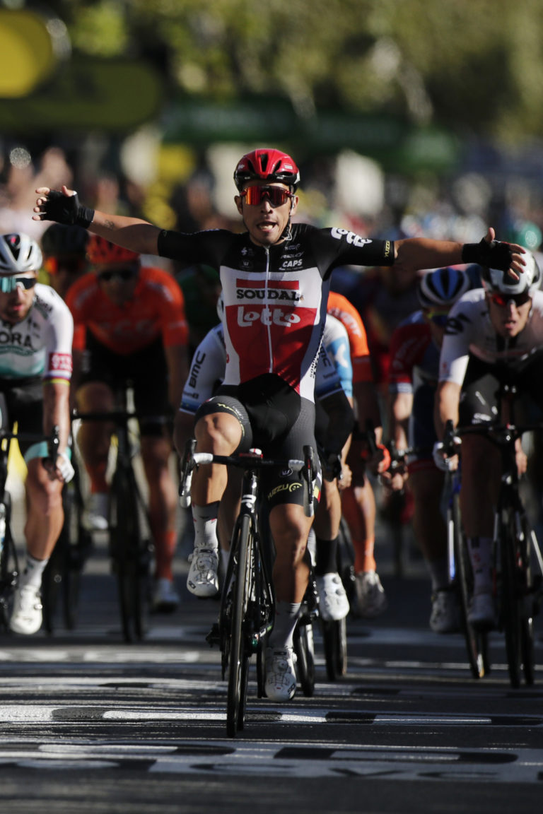 Austrálčan Caleb Ewan sa teší z triumfu v tretej etape Tour de France 2020 z Nice do Sisteronu. Sisteron, 31. august 2020. Foto: Benoit Tessier, Pool via AP.