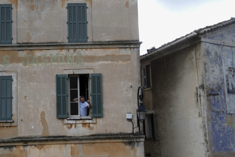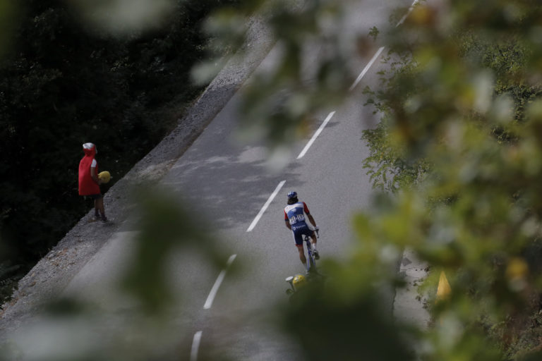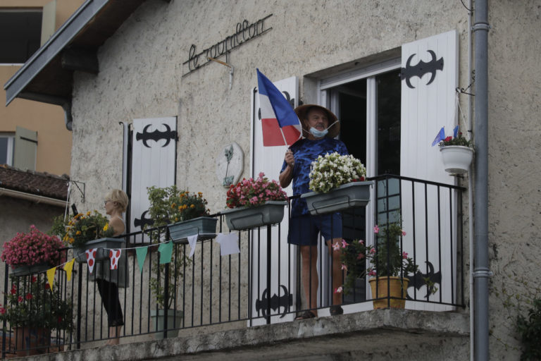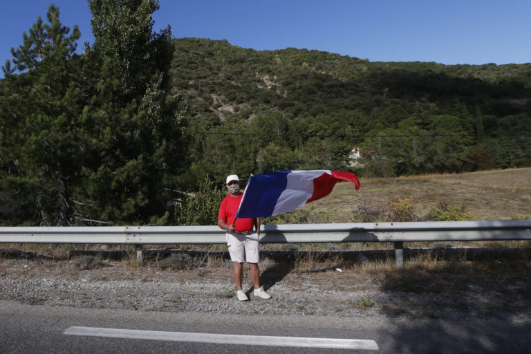 A spectator holds a French flag as he waits for the riders to pass during the third stage of the Tour de France cycling race over 198 kilometers (123 miles), with start in Nice and finish in Sisteron, southern France, Monday, Aug. 31, 2020. (AP Photo/Christophe Ena) Foto: SITA/AP.