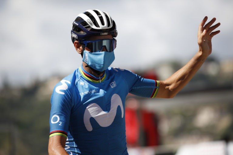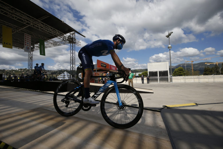 Španielsky cyklista Alejandro Valverde pred štartom 3. etapy Tour de France 2020 z Nice do Sisteron. Nice, 31. august 2020. Foto: Sebastien Nogier, Pool via AP.