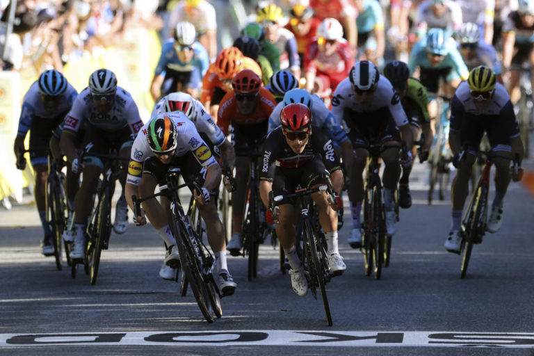 Slovenský cyklista Peter Sagan (druhý zľava) v záverečnom špurte o triumf v 3. etape Tour de France 2020 z Nice do Sisteronu, v ktorej obsadil piatu priečku. Sisteron, 31. august 2020. Foto: Kenzo Tribouillard, Pool via AP.