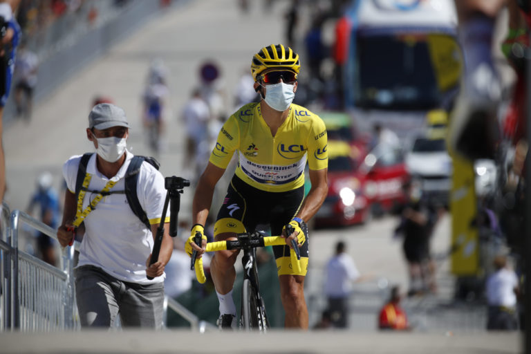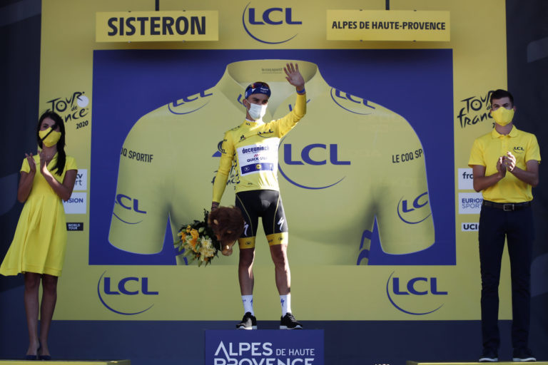 Francúz Julian Alaphilippe na pódiu v žltom drese lídra po tretej etapy Tour de France 2020 z Nice do Sisteronu. Sisteron, 31. august 2020. Foto: Kenzo Tribouillard, Pool via AP.