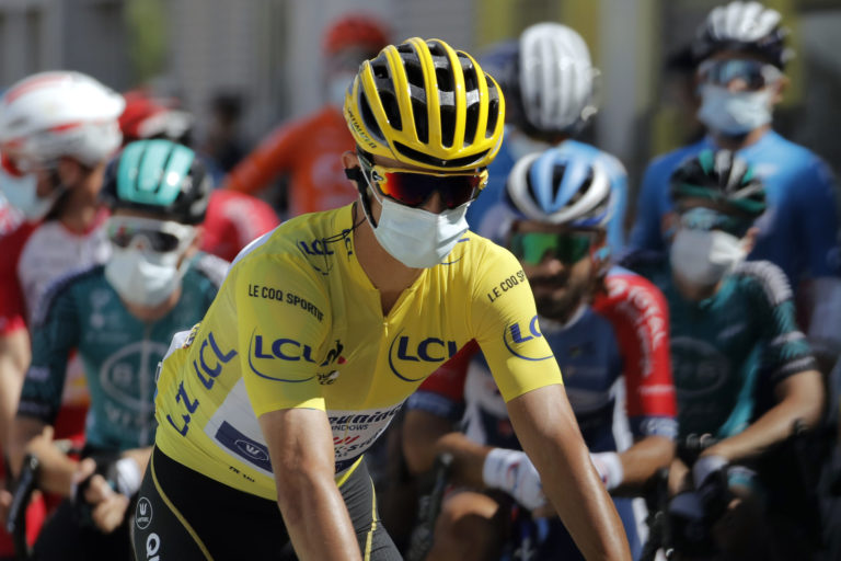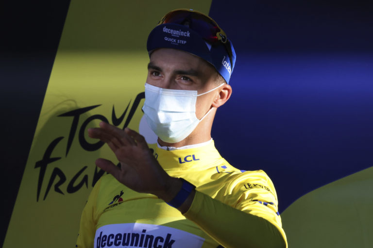 Francúz Julian Alaphilippe na pódiu v žltom drese lídra po tretej etapy Tour de France 2020 z Nice do Sisteronu. Sisteron, 31. august 2020. Foto: Benoit Tessier, Pool via AP.