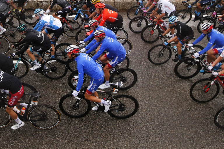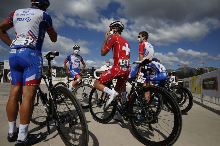 Švajčier Sebastien Reichenbach (uprostred) pred štartom 3. etapy Tour de France 2020 z Nice do Sisteron. Nice, 31. august 2020. Foto: Sebastien Nogier, Pool via AP.