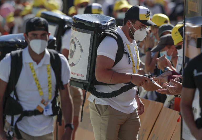 Spectators get their hands sanitized in the finish area of the fourth stage of the Tour de France cycling race, over 160,5 kilometers (99,7 miles) with start in Sisteron and finish in Orcieres-Merlette, southern France, Tuesday, Sept.1, 2020. () Foto: Stephane Mahe/Pool via AP.