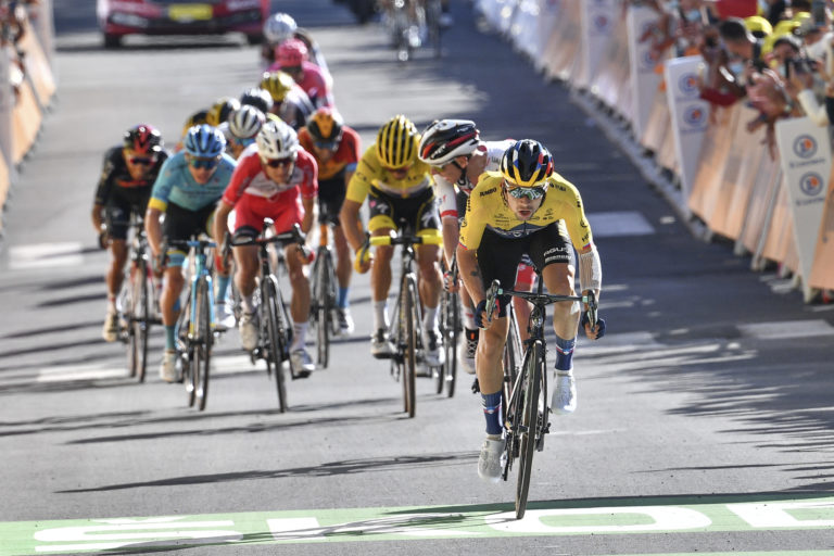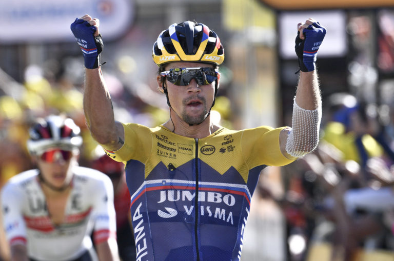 Slovinec Primož Rogič sa teší z triumfu v 4. etape Tour de France 2020 zo Sisteronu na vrchol stúpania Orcières-Merlette. Orcières-Merlette, 1. september 2020. Foto: Anne-Christine Poujoulat, Pool via AP.