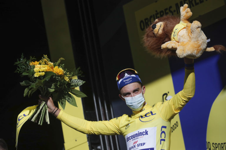 Francúz Julian Alaphilippe v žltom drese lídra pretekov po štvrtej etapy Tour de France 2020 zo Sisteronu na vrchol stúpania v Orcières-Merlette. Orcières-Merlette, 1. september 2020. Foto: Anne-Christine Poujoulat, Pool via AP.