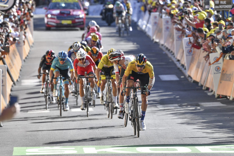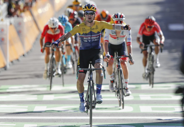 Slovinec Primož Roglič (Jumbo Visma) prichádza do cieľa štvrtej etapy Tour de France 2020 zo Sisteronu na vrchol stúpania v Orcières-Merlette. Orcières-Merlette, 1. september 2020. Foto: Anne-Christine Poujoulat, Pool via AP.