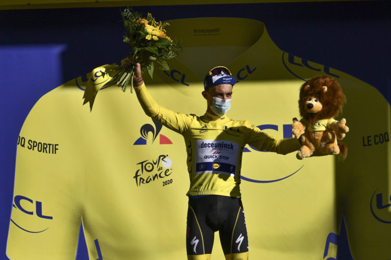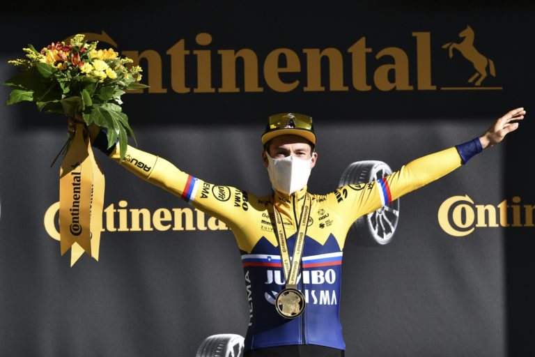 Slovinec Primož Roglič na pódiu po jeho triumfe v 4. etape Tour de France 2020 zo Sisteronu na vrchol stúpania v Orcières-Merlette. Orcières-Merlette, 1. september 2020. Foto: Anne-Christine Poujoulat, Pool via AP.
