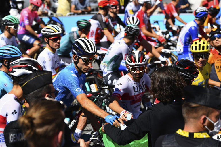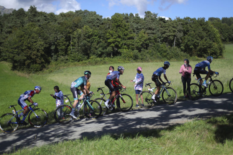 Cyklisti pred štartom štvrtej etapy Tour de France 2020 zo Sisteronu do Orcières-Merlette. Sisteron, 1. september 2020. Foto: Stuart Franklin/ pool via AP Photo.