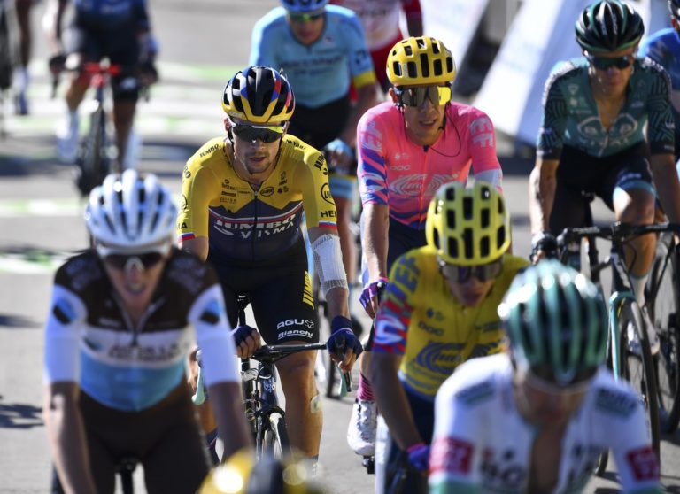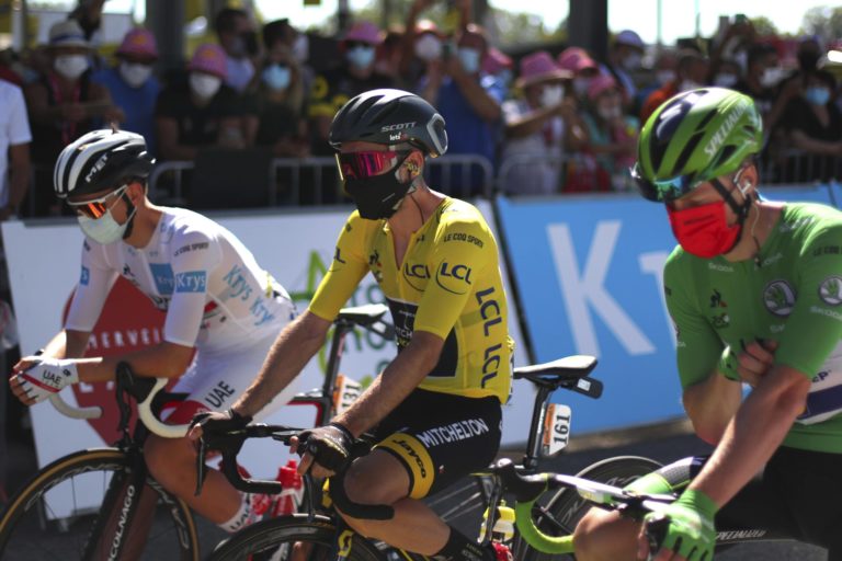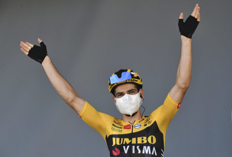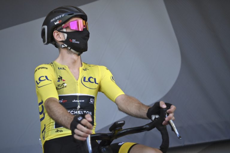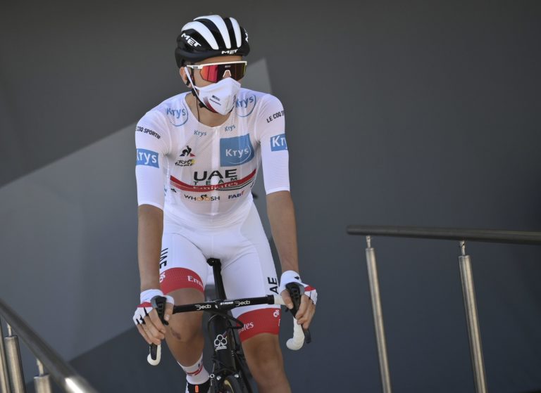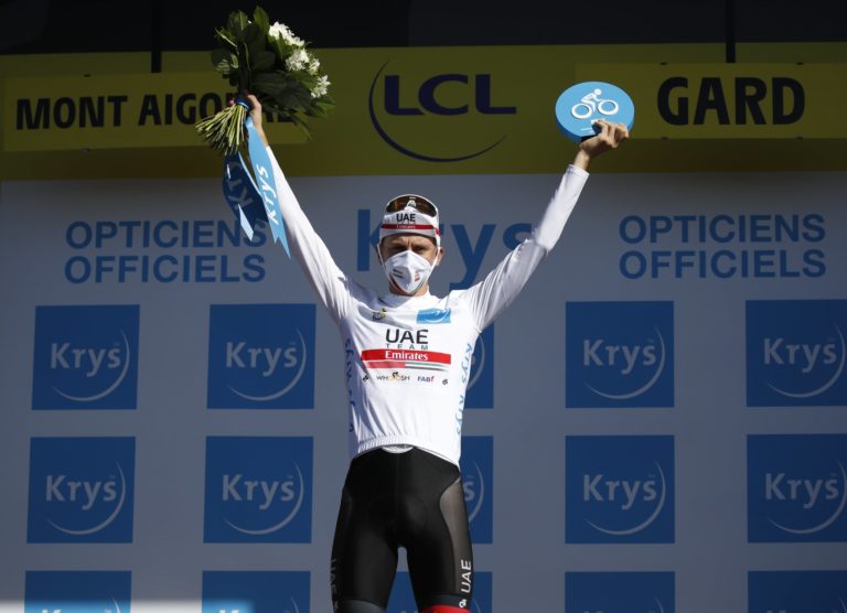 Biely dres si obliekol Tadej Pogacar. 3. september 2020 Foto: SITA/AP