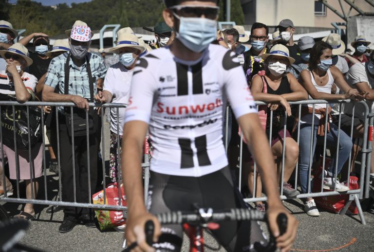 Belgický cyklista Tiesj Benoot pred štartom 6. etapy Tour de France v spoločnosti fanúšikov s rúškami. 3. september 2020 Foto: SITA/AP