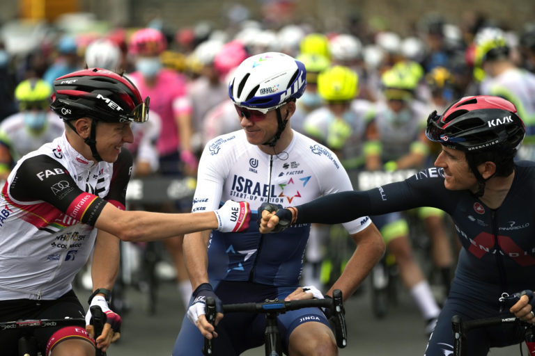 Slovinský cyklista Tadej Pogačar (vľavo) a britskí cyklisti Geraint Thomas (vpravo) a Chris Foome (uprostred) pred štartom 1. etapy Tour de France 2021 v Breste. 26. júna 2021 Foto: SITA/AP