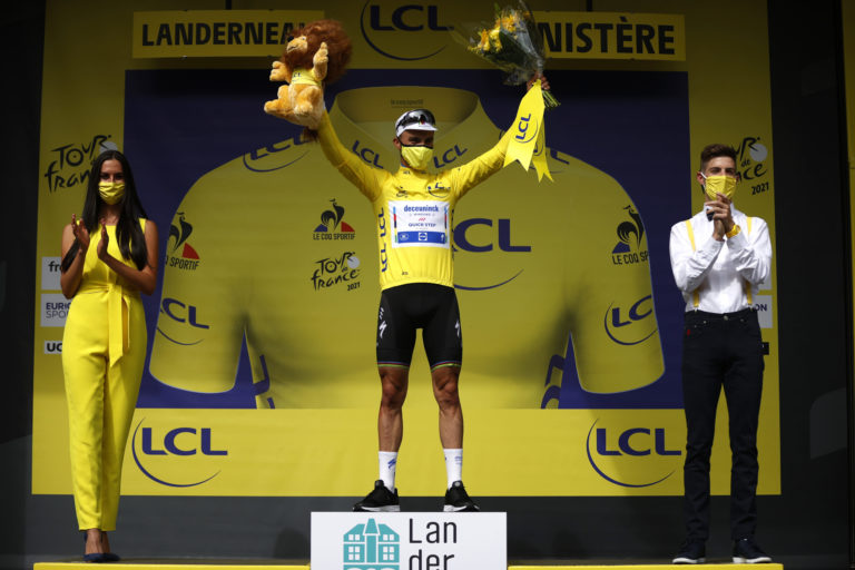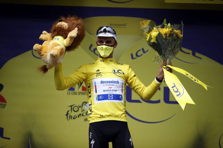 Francúzsky cyklista Julien Alaphilippe v žltom drese, ktorý získal z víťazstva v 1. etape na Tour de France, ktorá sa začala v Breste a končila v Landerneau. 26. júna 2021 Foto: SITA/AP