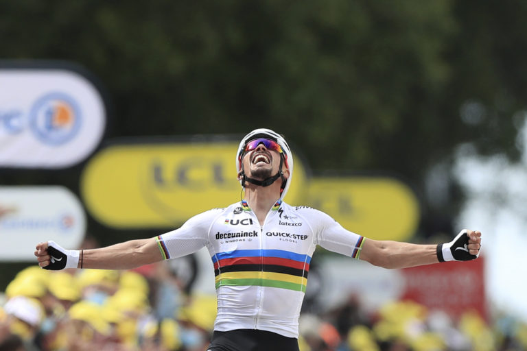 Francúzsky cyklista Julien Alaphilippe sa stal víťazom 1. etapy na Tour de France, ktorá sa začala v Breste a končila v Landerneau. 26. júna 2021 Foto: SITA/AP