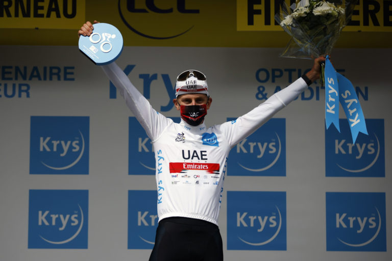 Slovinský cyklista Tadej Pogačar získal v 1. etape na Tour de France biely dres. 26. júna 2021 Foto: SITA/AP