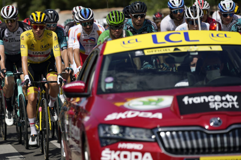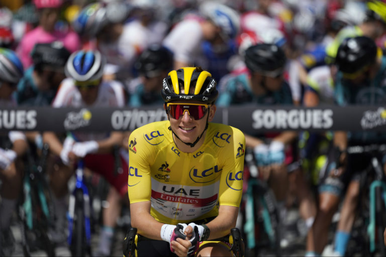 Slovinský cyklista Tadej Pogačar v žltom drese lídra pred štartom 11. etapou Tour de France 2021 zo Sorgues do Malaucéne (198,9 km). Sorgues, 7. júl 2021. Foto: SITA/AP.