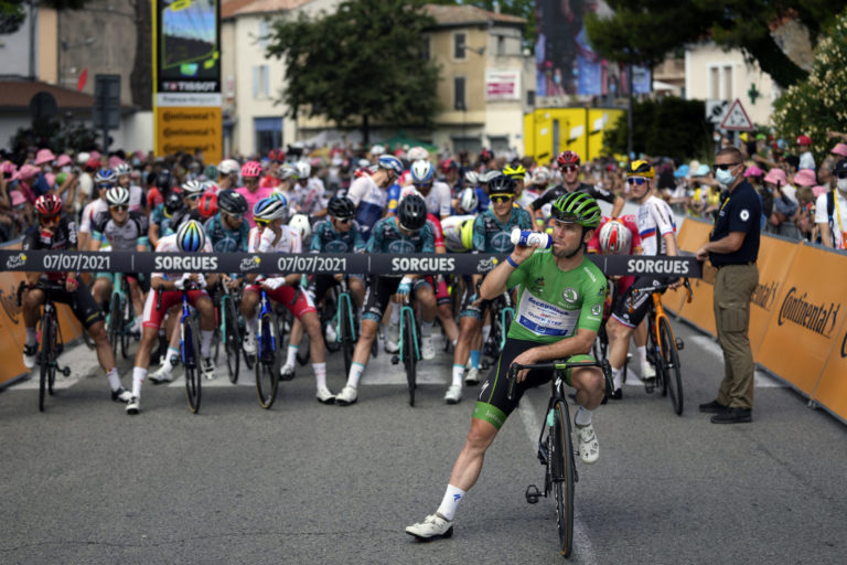 Britský cyklista Mark Cavendish v zelenom drese lídra bodovacej súťaže pred štartom 11. etapou Tour de France 2021 zo Sorgues do Malaucéne (198,9 km). Sorgues, 7. júl 2021. Foto: SITA/AP.
