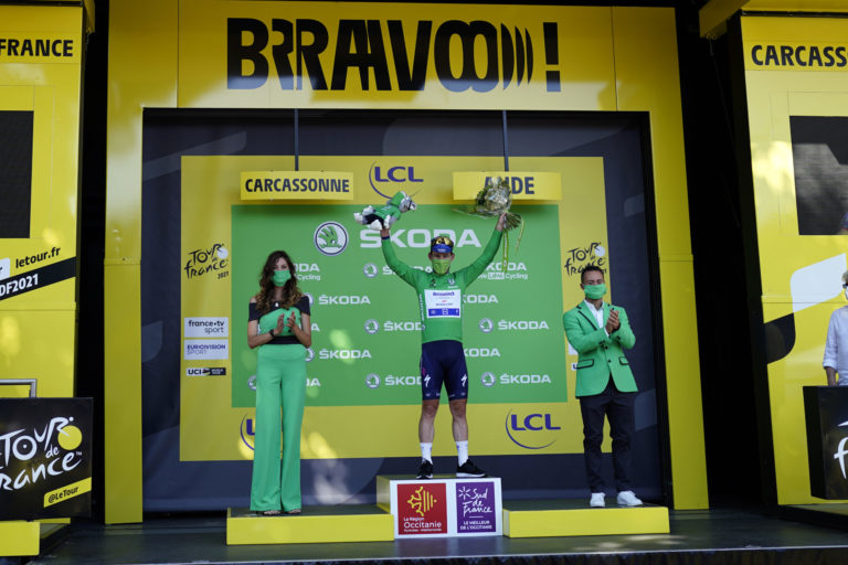 Priebežný líder bodovacej súťaže Mark Cavendish na stupni víťazov po 13. etape Tour de France z Nimes do Carcassonne (219.9 km). 9. júl 2021. Foto: SITA/AP