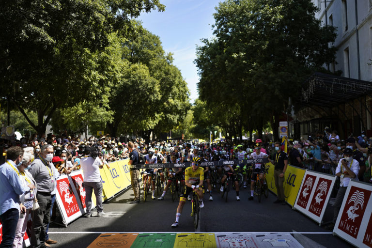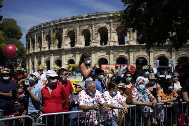 Fanúšikovia pred štartom 13. etapy Tour de France z Nimes do Carcassonne (219.9 km). 9. júl 2021. Foto: SITA/AP