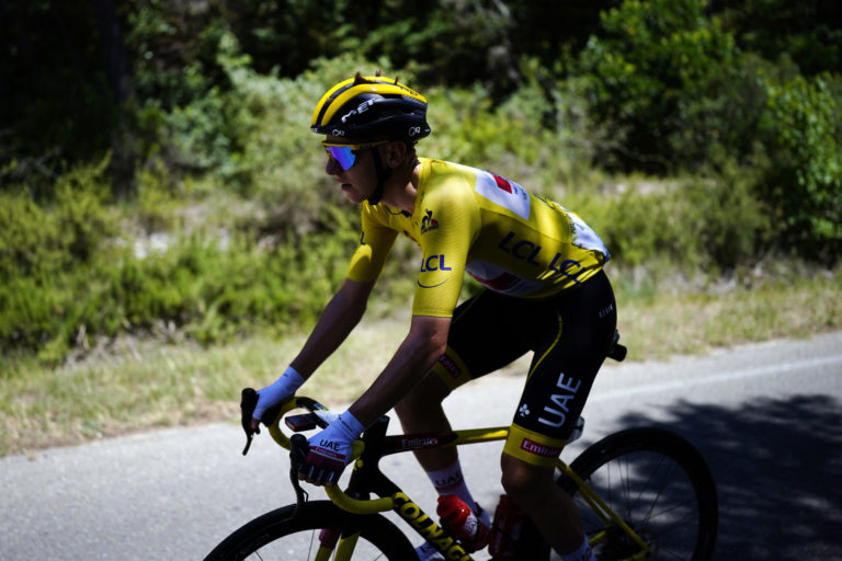 Priebežný líder Tadej Pogačar počas 13. etapy Tour de France z Nimes do Carcassonne (219.9 km). 9. júl 2021. Foto: SITA/AP