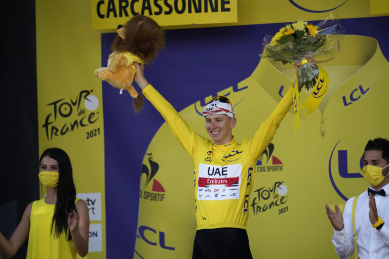Priebežný líder celkového poradia Tadej Pogačar na stupni víťazov po 13. etape Tour de France z Nimes do Carcassonne (219.9 km). 9. júl 2021. Foto: SITA/AP
