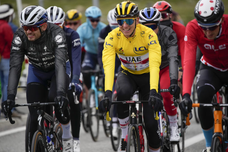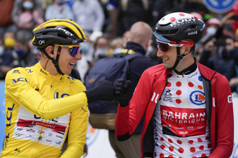 Slovinský cyklista Tadej Pogačar v žiltom drese a holandský cyklista Wouter Poels pred začiatkom 16. etapy na Tour de France z Pas De La Case do Saint Gaudens. 13. júl 2021 Foto: SITA/AP