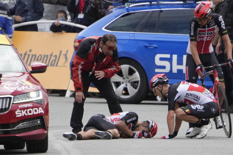 Austrálsky cyklista Caleb Ewan leží na zemi po páde v záverečnom šprinte počas 3. etapy Tour de France 2021 z Lorientu do Pontivy (182,9 km). Foto: SITA/AP