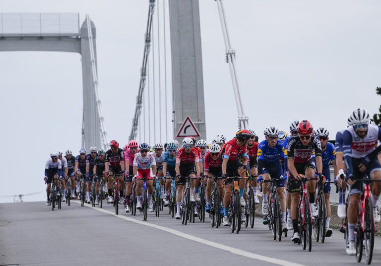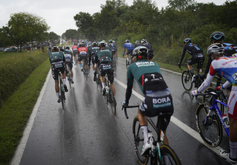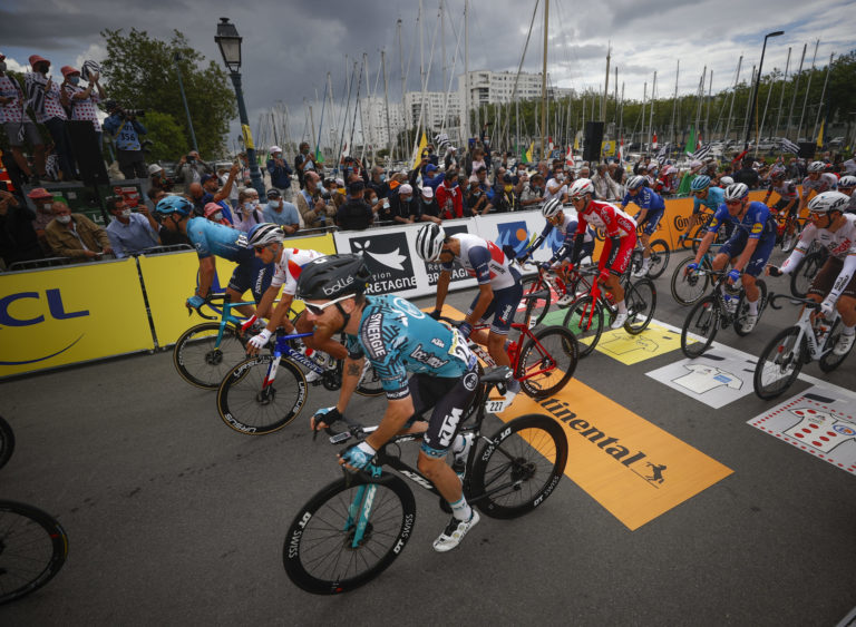 Cyklisti na štarte 3. etapy Tour de France 2021 z Lorientu do Pontivy (182,9 km). Lorient, 28. jún 2021. Foto: Chris Graythen/Pool Photo via AP.