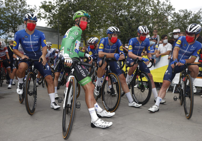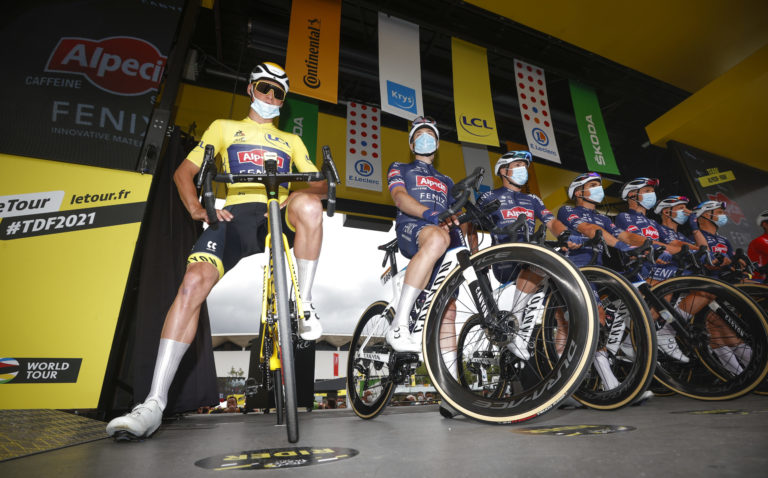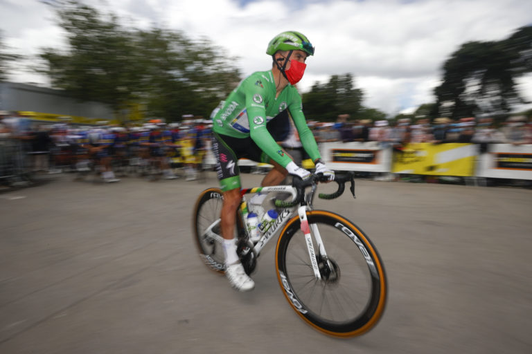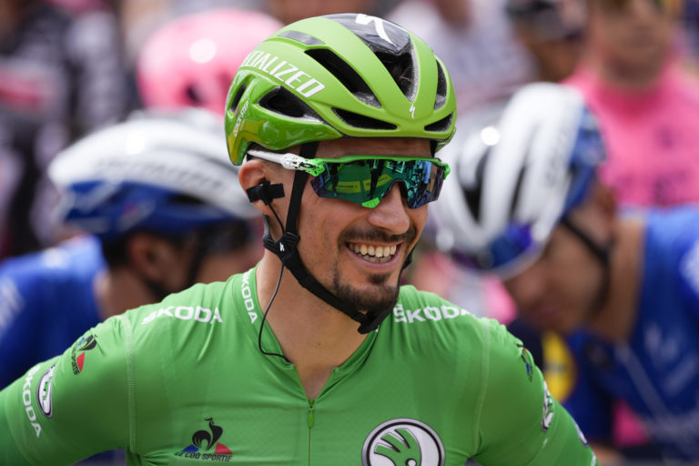 Francúz Julian Alaphilippe v zelenom drese lídra bodovacej súťaže pred štartom 3. etapy Tour de France 2021 z Lorientu do Pontivy (182,9 km). Lorient, 28. jún 2021. Foto: Chris Graythen/Pool Photo via AP.