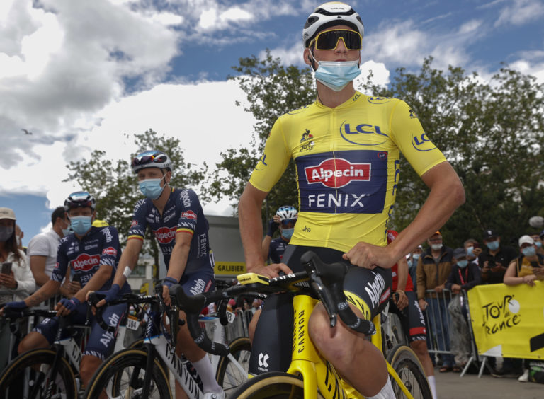 Holandský cyklista Mathieu Van Der Poel v žltom drese lídra pred štartom 3. etapy Tour de France 2021 z Lorientu do Pontivy (182,9 km). Lorient, 28. jún 2021. Foto: Chris Graythen/Pool Photo via AP.