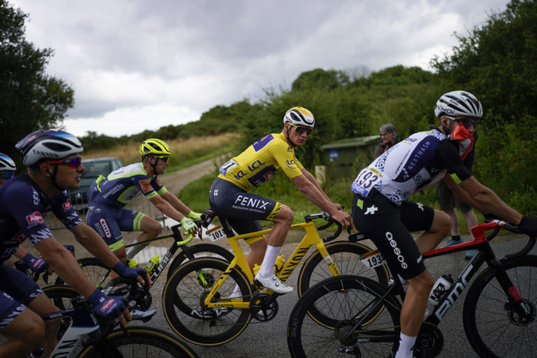 Holandský cyklista Mathieu Van Der Poel v žltom drese lídra počas 3. etapy Tour de France 2021 z Lorientu do Pontivy (182,9 km). Foto: SITA/AP.