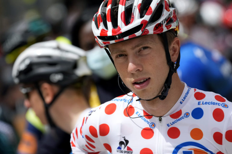 Holandský cyklista Ide Schelling v bodkovanom drese pred začiatkom 4. etapy na Tour de France z Redonu do Fougéres. 29. júna 2021 Foto: SITA/AP