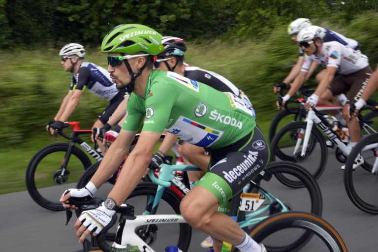 Slovenský cyklista Peter Sagan (druhý zľava) finišoval na 5. mieste v štvrtej etape Tour de France 2021 z Redonu do Fougéres (150,.4 km). Fougéres, 29. jún 2021. Foto: Guillaume Horcajuelo, Pool Photo via AP.