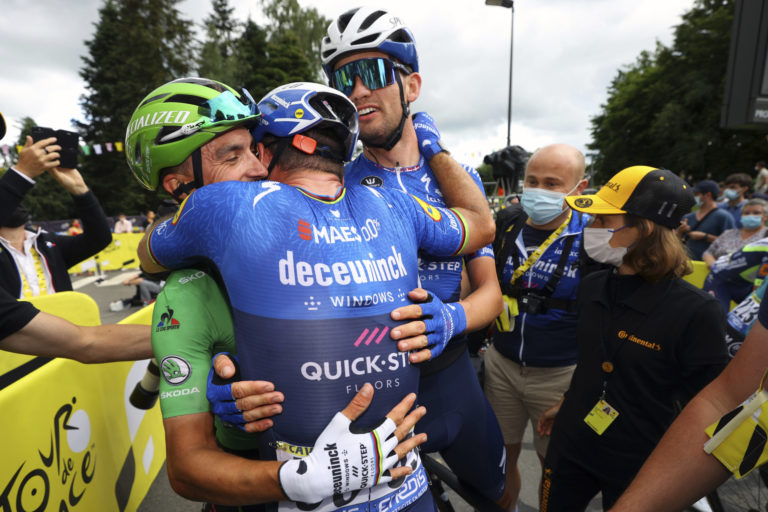 Francúz Julian Alaphilippe v zelenom drese gratuluje víťazovi 4. etapy Tour de France Markovi Cavendishovi (v strede). 29. jún 2021. Foto: SITA/AP