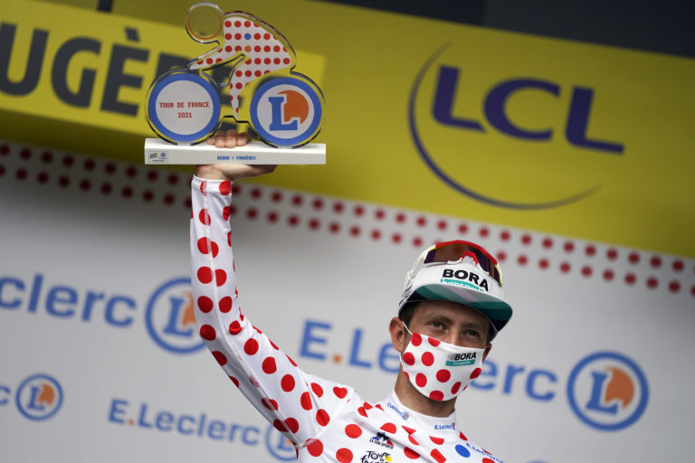 Holandský cyklista Ide Schelling v bodkovanom drese na pódiu po 4. etape na Tour de France z Redonu do Fougéres. 29. júna 2021. Foto: SITA/AP