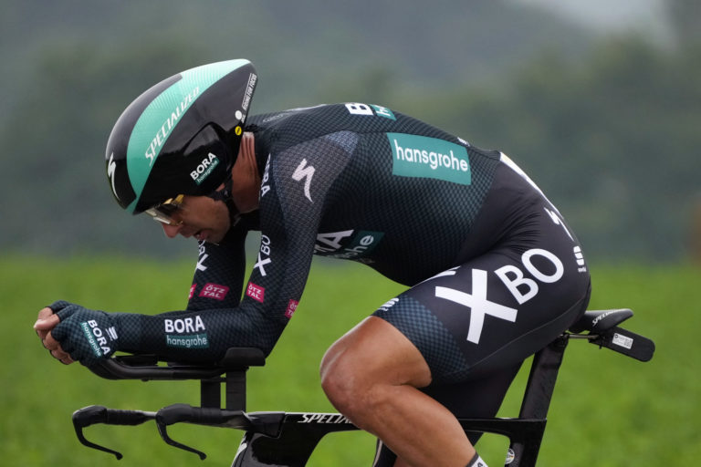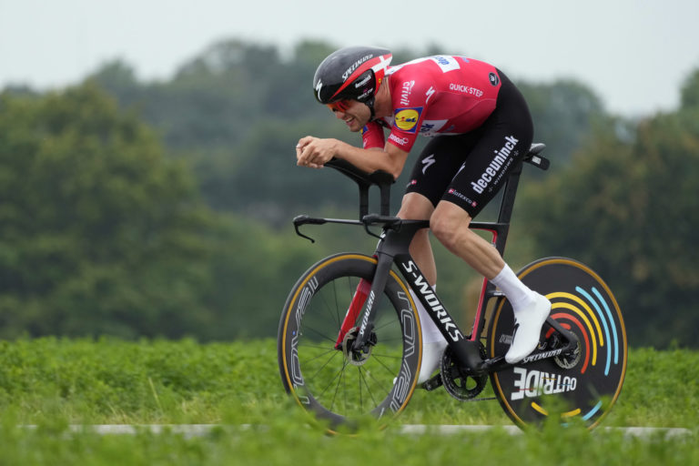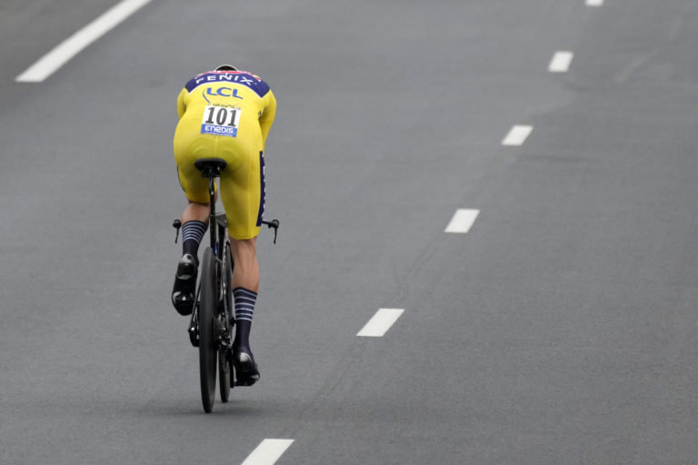 Dán Kasper Asgreen počas 5. etapy Tour de France 2021, ktorou bola časovka na 27,2 kilometra zo Changé do Laval. 30. júna 2021. Foto: SITA/AP.