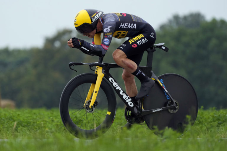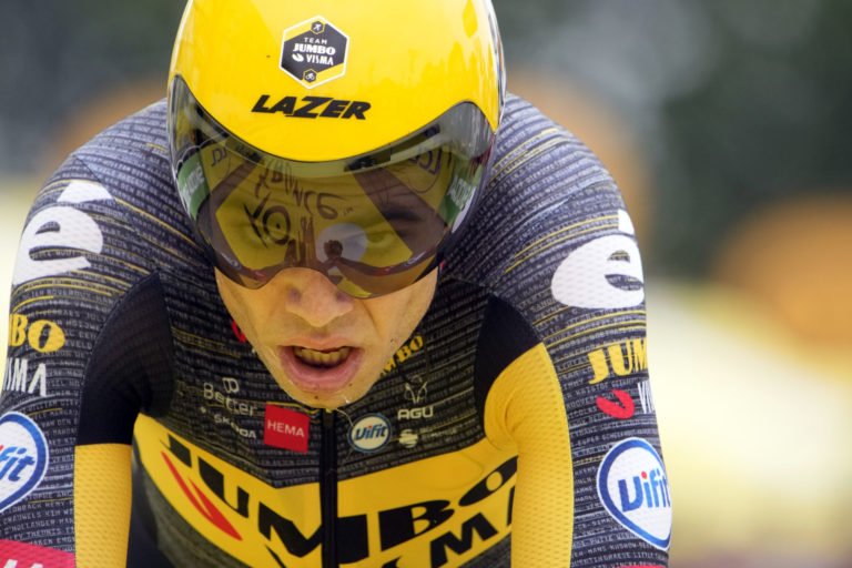 Slovinec Primoz Roglič počas 5. etapy Tour de France 2021, ktorou bola časovka na 27,2 kilometra zo Changé do Laval. 30. júna 2021 Foto: SITA/AP.