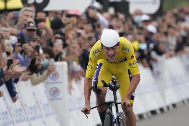 Holanďan Mathieu Van Der Poel v žltom drese prechádza cieľom 5. etapy Tour de France 2021, ktorou bola časovka na 27,2 kilometra zo Changé do Laval. 30. júna 2021 Foto: SITA/AP.