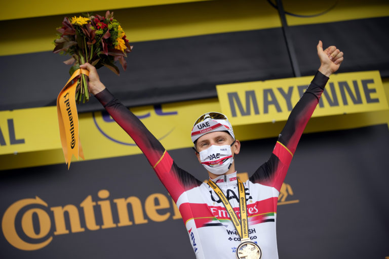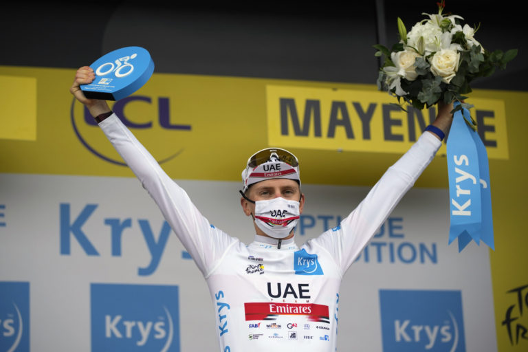 Slovinec Tadej Pogačar z tímu UAE Team Emirates oslavuje na pódiu svoje víťazstvo. 5. etapa Tour de France 2021, 30. júna 2021. Foto: SITA/AP.