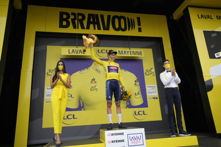 Holanďan Mathieu Van Der Poel na pódiu v žltom drese. 5. etapa Tour de France. 30. júna 2021. Foto: SITA/AP.