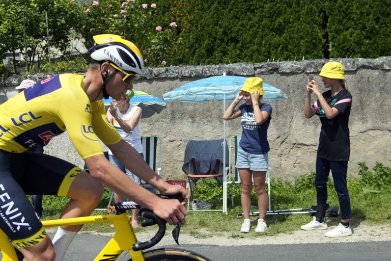 Holanďan Mathieu van der Poel v žltom drese pre priebežného lídra počas 6. etapy Tour de France z Tours do Chateauroux. Foto: SITA/AP