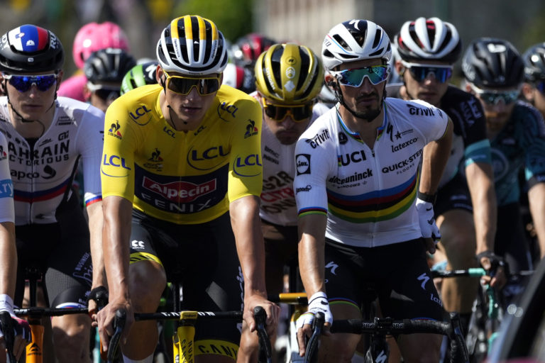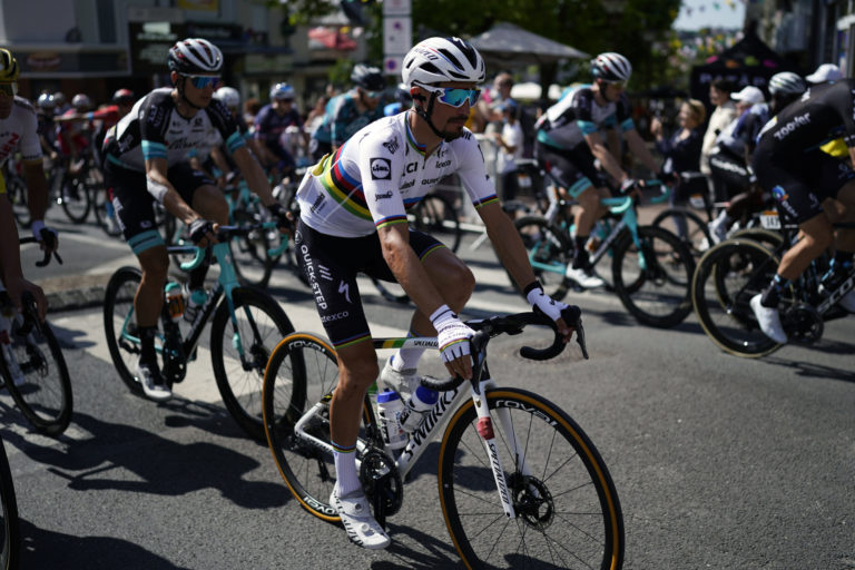 Francúzsky cyklista Julian Alaphilippe počas pretekov 7. etapy Tour de France 2021 z Vierzonu do Le Creusot (249,1 km). Vierzon, 2. júl 2021. Foto: AP Photo/Daniel Cole