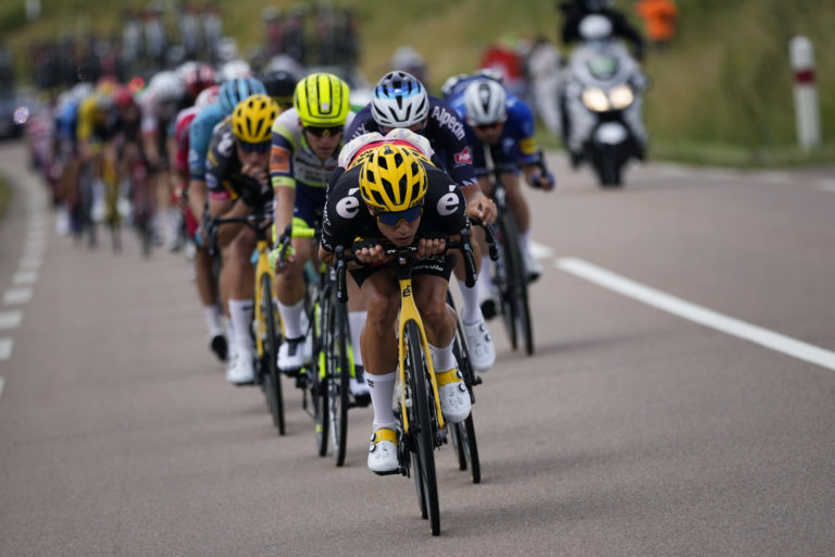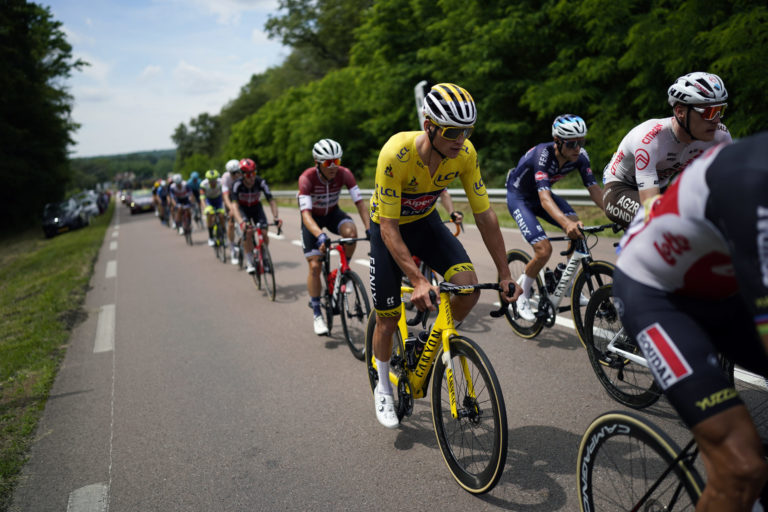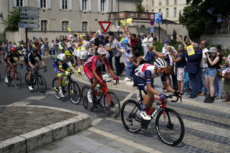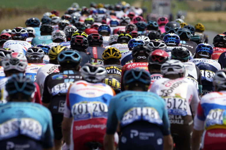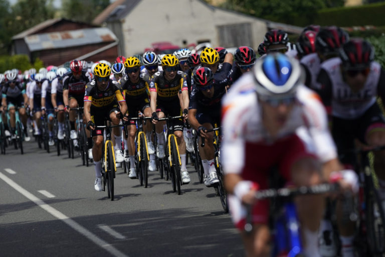 Cyklisti počas pretekov 7. etapy Tour de France 2021 z Vierzonu do Le Creusot (249,1 km). Vierzon, 2. júl 2021. Foto: AP Photo/Daniel Cole