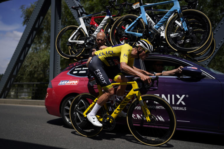 Holandský cyklista Mathieu Van Der Poel v žltom drese lídra počas pretekov 7. etapy Tour de France 2021 z Vierzonu do Le Creusot (249,1 km). Vierzon, 2. júl 2021. Foto: AP Photo/Daniel Cole