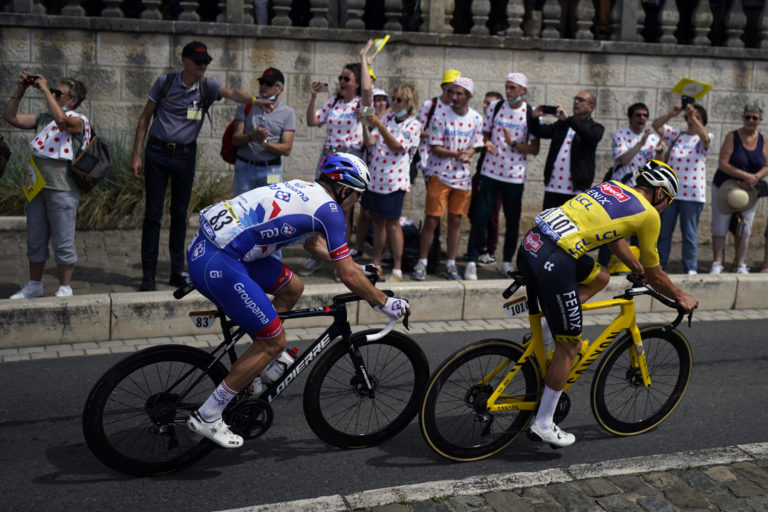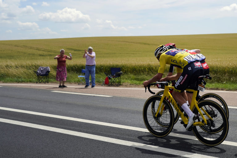 Holandský cyklista Mathieu Van Der Poel v žltom drese lídra a francúzsky cyklista Julian Alaphilippe počas pretekov 7. etapy Tour de France 2021 z Vierzonu do Le Creusot (249,1 km). Vierzon, 2. júl 2021. Foto: AP Photo/Daniel Cole