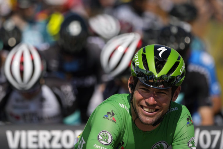 Britský cyklista Mark Cavendish v zelenom drese pre najlepšieho šprintéra pred začiatkom pretekov 7. etapy Tour de France 2021 z Vierzonu do Le Creusot (249,1 km). Vierzon, 2. júl 2021. Foto: AP Photo/Daniel Cole
